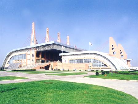 斜拉索結(jié)構(gòu),造型新穎大方,現(xiàn)代氣息濃厚。50米×25.2米的縣空游泳池,幾何尺寸誤差僅為2毫米,結(jié)構(gòu)試水月余無(wú)滲漏。